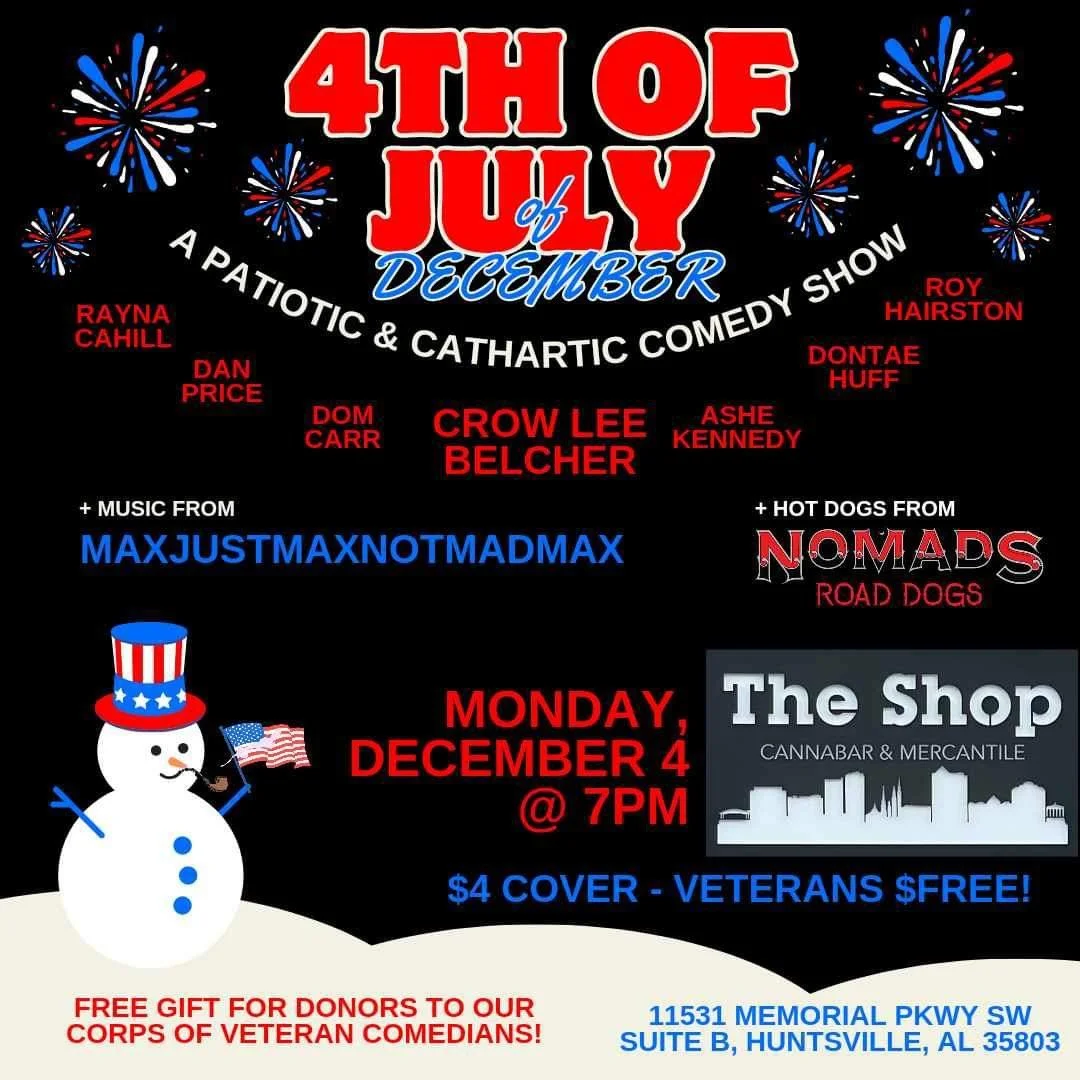 4th of July of December - Huntsville Monday, December 4, 2023 7:00 PM 9:50 PM The Shop Canabar & Mercantile 11531 Memorial Parkway Southwest Huntsville, AL, 35803 United States (map) Google Calendar ICS